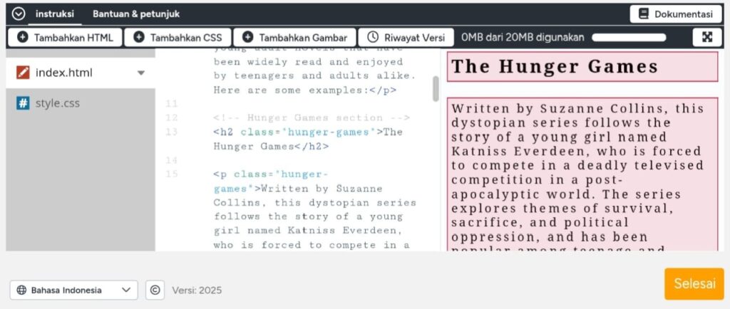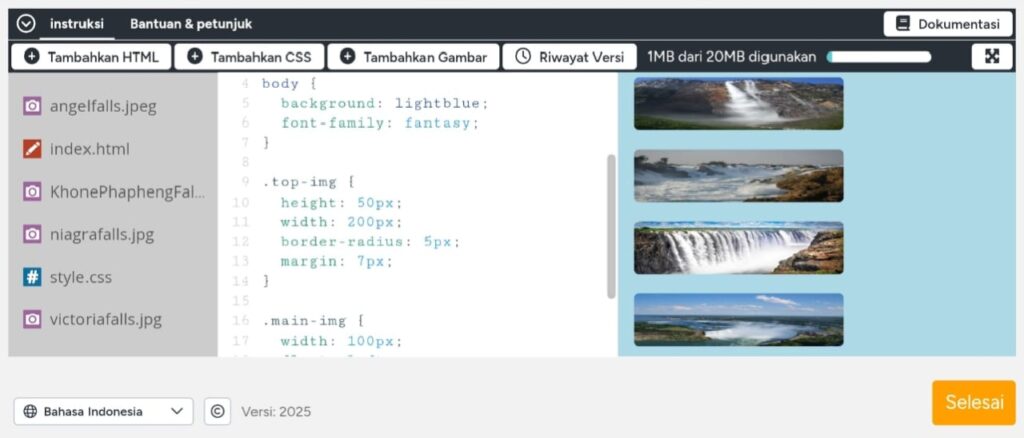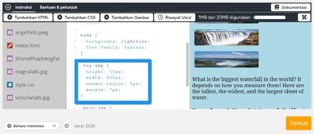 Di lv ke dua kita di suruh mendesain foto air terjun di bawah judul, tutorny adalah kita ke bagian style css lalu ikuti seperti yang ada di foto berikut.